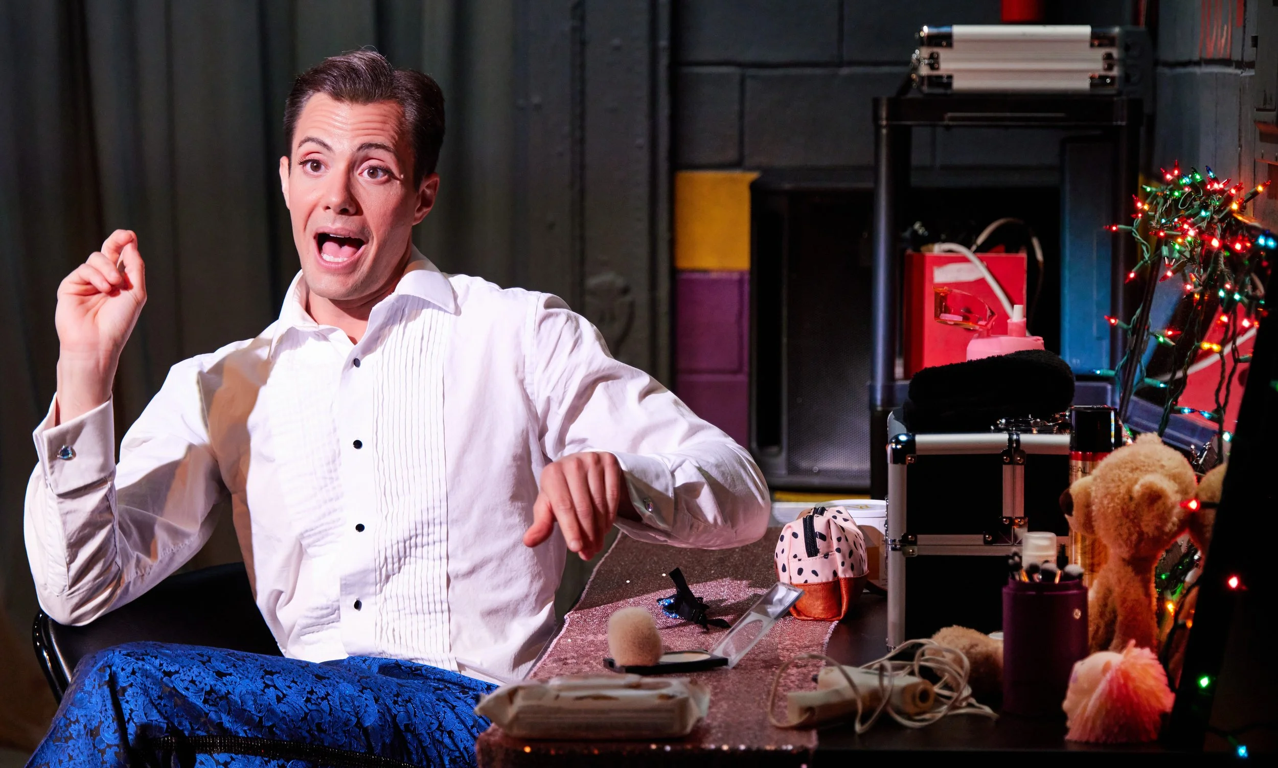 For the various competitions, Hunter Kaczorowski has provided a royal blue suit, a variety of colorful gowns, and a red dress for Taylor’s performance of “Rose’s Turn” from Gypsy—as well as silken robes for lounging, and a wildly comic pair of boxer shorts.