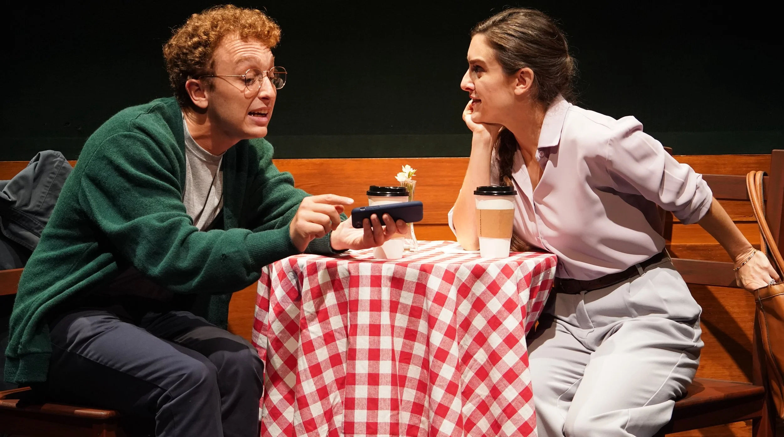 What is foremost in Lukesh’s mind is the absence of his wife, Natalya (Dani Stoller). Lukesh uses visual aids in his lectures and sometimes overshares about his private life: projected texts from his wife read “I’ll be gone for a while,” followed by, “Possibly forever” (projections designed by Mona Kasra).