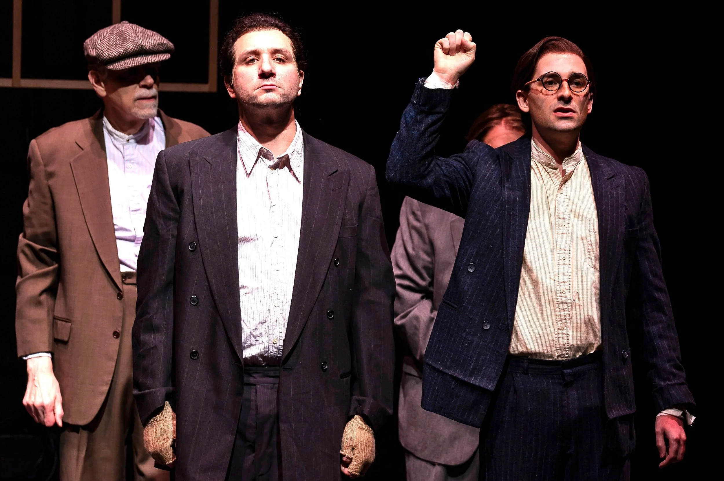 He does dwell frequently on the family, and some of the best moments spring from that. Buturla is a steady, dignified Litten père. And Barbara McCulloh, as Hans’s doting mom, a role that could easily be overplayed, keeps the emotions restrained and honest (though the parents joking over nostalgic family memories while Hans is interred at Dachau feels off). She’s the only actor besides Yaiullo not to play multiple roles, and the rest of the company—Robert Ierardi, Whit K. Lee, and Marco Torriani (who was absent at the performance I saw; other actors capably took over)—slip comfortably in and out of identities. Lee even plays Kurt Weill, to Torriani’s Bertolt Brecht, in a chance encounter with Litten; he in no way resembles Weill, but he does give out with a lusty “Alabama Song.”