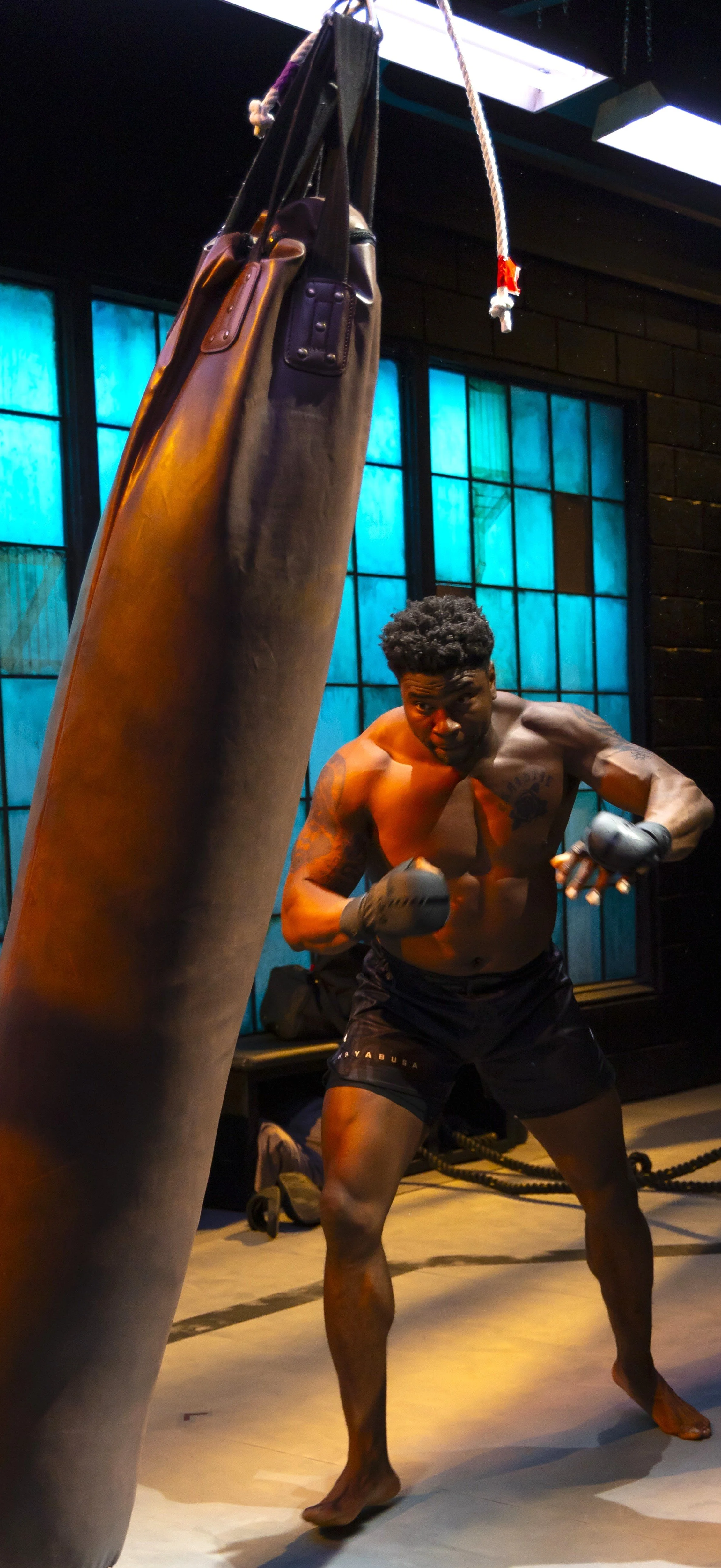 The play then moves through several time leaps, and eventually Big decides that Lil’s time to start training as a fighter has arrived. No sports story is complete without a training montage, which the production accomplishes with the aid of Sulaiman’s original music, Andrew Boyce’s scenic design of gliding, hanging punching bags, and Mika Eubanks’s ingenious costume design, in which each new stage of Lil’s progress is marked by her shedding layers into different iterations of fighting gear. And then there is Mizzelle’s own physical prowess with the moves; both she and Onaodowan stage their respective fights in powerful solo renditions that juxtapose the violence of the sport with a kind of beauty.