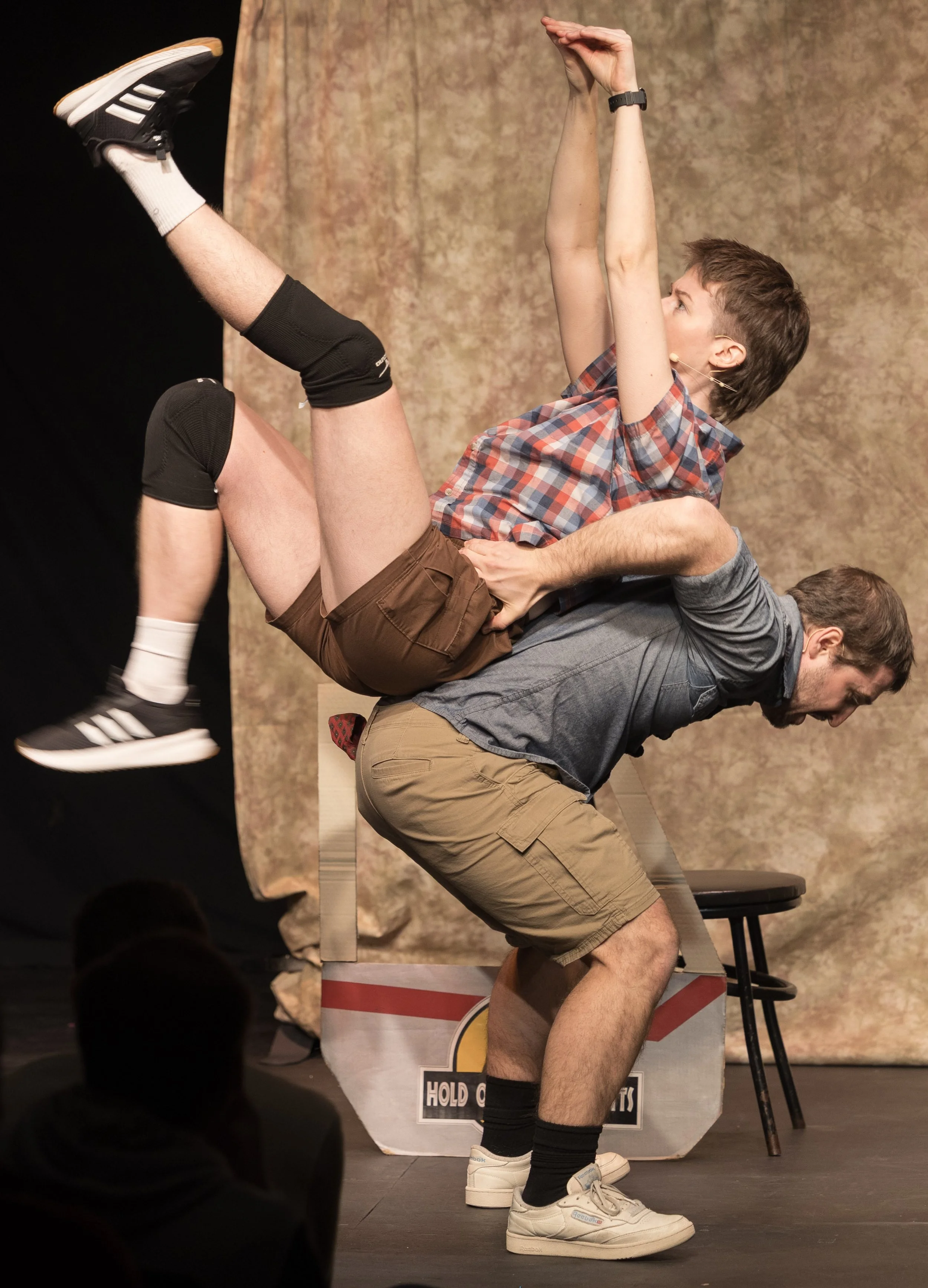The gloriously unhinged physical comedy executed by Rich and Abeel includes creating a dinosaur with their bodies. Photographs by JT Anderson.