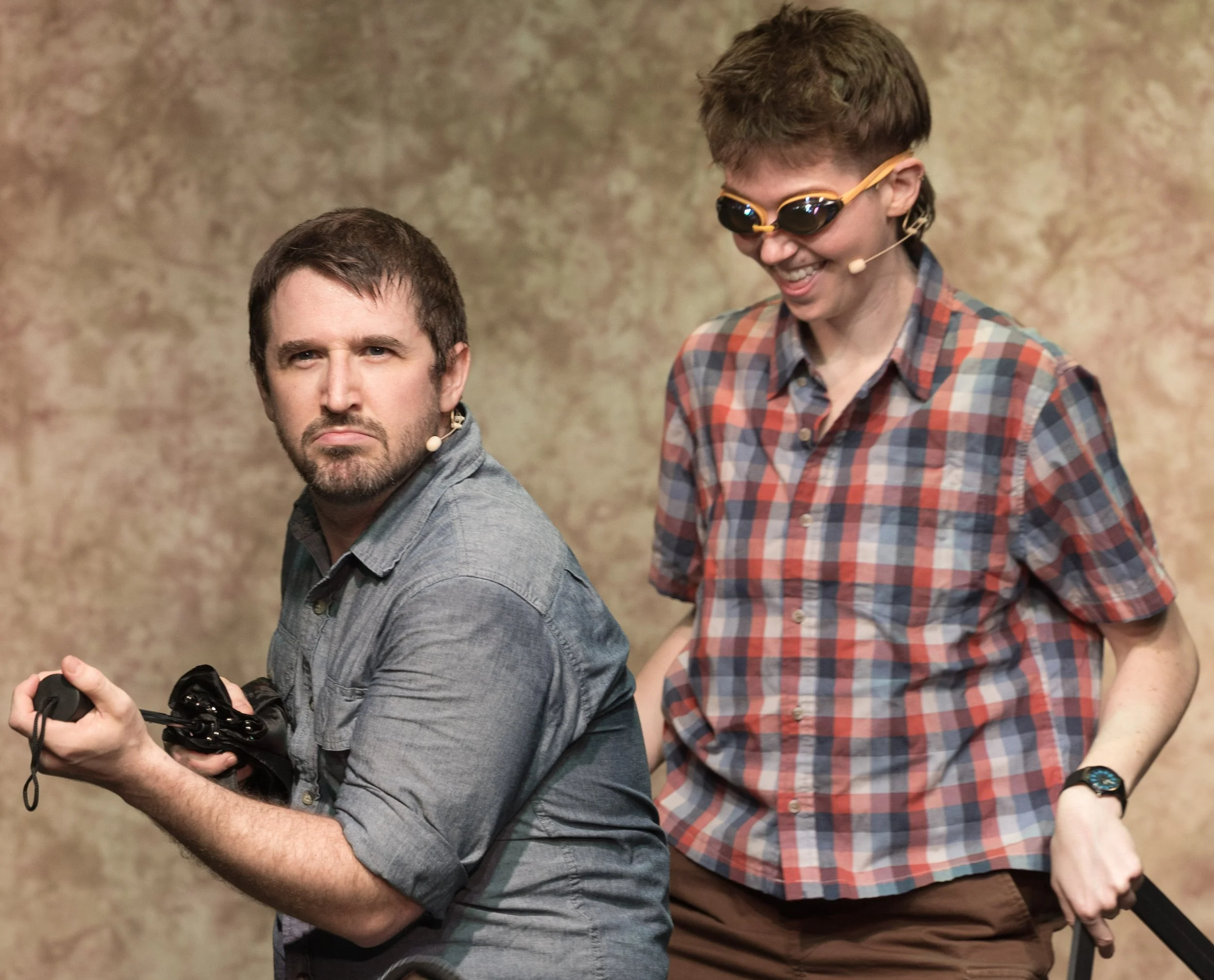 What makes Hold On to Your Butts truly hum—and serves as its secret weapon—is its onstage sound-effects artist, Kelly Robinson (rotating with Busbee at selected performances). She conjures an array of noises using household objects, synchronizing each with the actors’ live performances. Coconut shells become footsteps; water-soaked chamois cloth produces organic squelches; cups, glass jars, cardboard, and cutlery supply the necessary crashes and rustles. Though consistently comic, the effect turns painfully funny when Robinson strikes her upper chest—like a self-flagellating medieval monk—to mimic a dinosaur’s thunderous tread. Most impressive of all, however, may be her vocal improvisation of buzzing electric fences, alternating with strident dino roars.