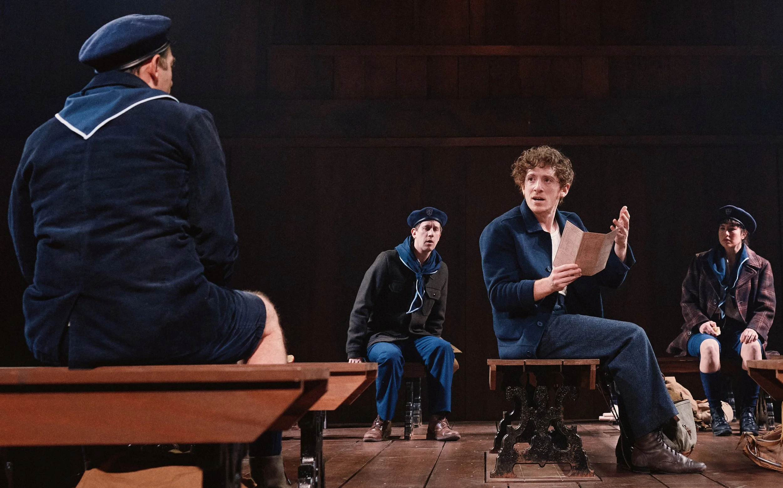 Hence, Marceau (Ethan Slater) chaperones four anxious 12-year-olds, two girls—Étiennette (Maddie Corman) and Berthe (Tedra Millan) and two boys—Henri (Alex Wyse) and Adolphe (Max Gordon Moore), all attired as Boy Scouts. They board a train to Annemasse, France, from where they can cross the Alps into Switzerland. Marceau is solely responsible for smuggling the children to safety. To escape detection by the Nazis on the train, he must maintain a calm environment, which is difficult. Although Berte is clever and communicative, she foresees only death and disaster, despite Marceau’s best efforts to assuage her fears. Millan captures Berthe’s charm and whiny pessimism.