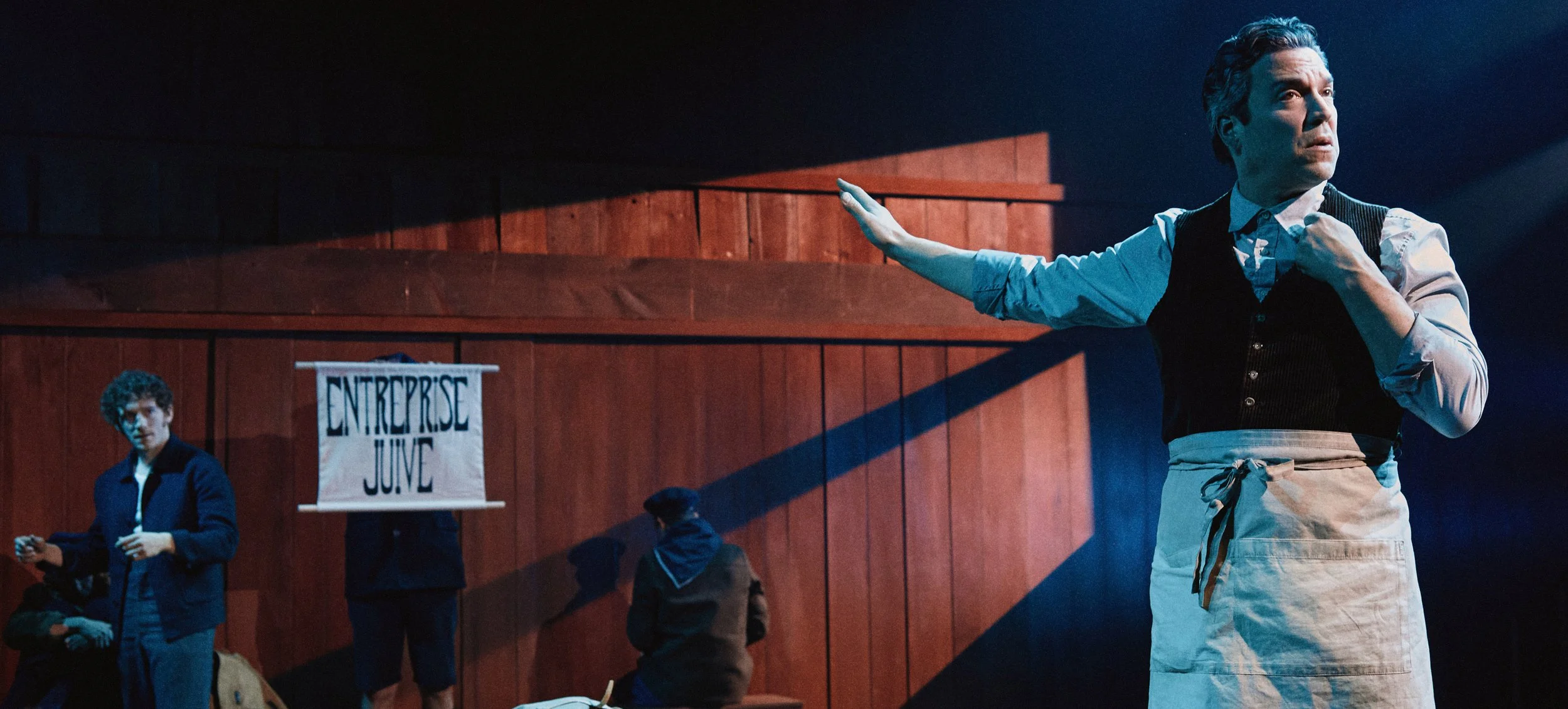 Scott Davis’s ingenious wooden thrust stage easily adapts from train carriage with retractable bench seats into the parental butcher shop, back to train carriage and then into a forest at the edge of the Swiss border. Lorenzo Pisoni’s economic yet strategic use of movement within the limited stage space rings true to Marceau’s art, in which finite gestures can have universal meaning.
