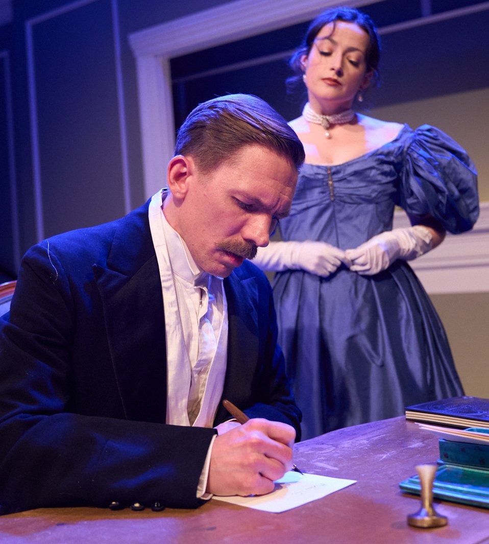 Lady Gertrude Chiltern (Madelyn Monaghan, right) pressures her husband Lord Robert Chiltern (Jed Peterson) to write a letter to a blackmailer in the Storm Theatre’s production of Oscar Wilde’s An Ideal Husband.