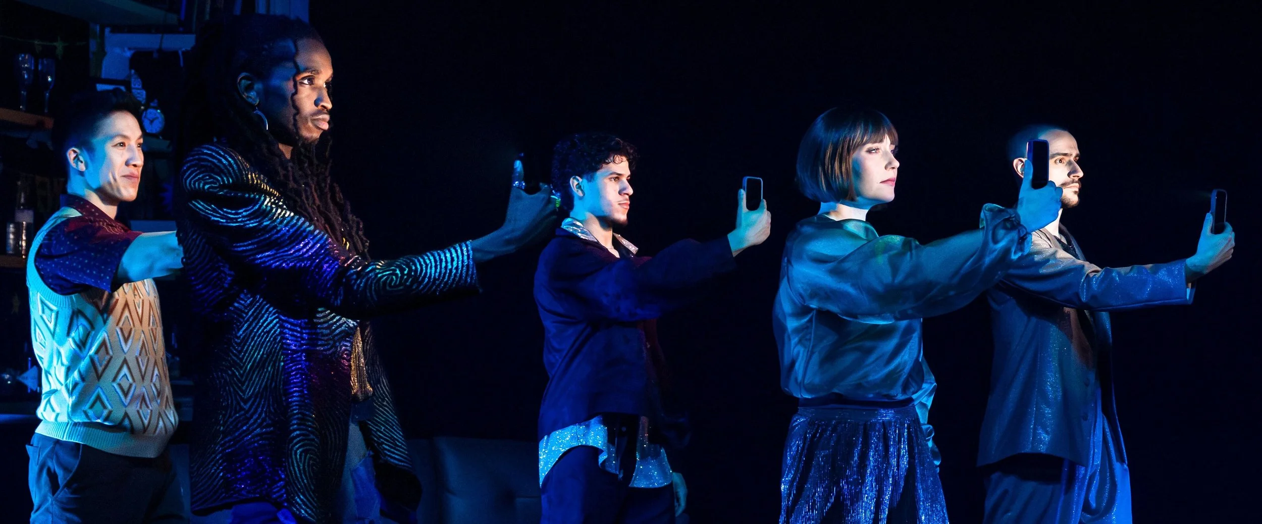 From left: Brendon Chan, Aché Richardson, Tyson Hill, and Marideth and Austin Telenko shine a light on their dancing with cell phones as they also livestream their performance of 11 to Midnight.