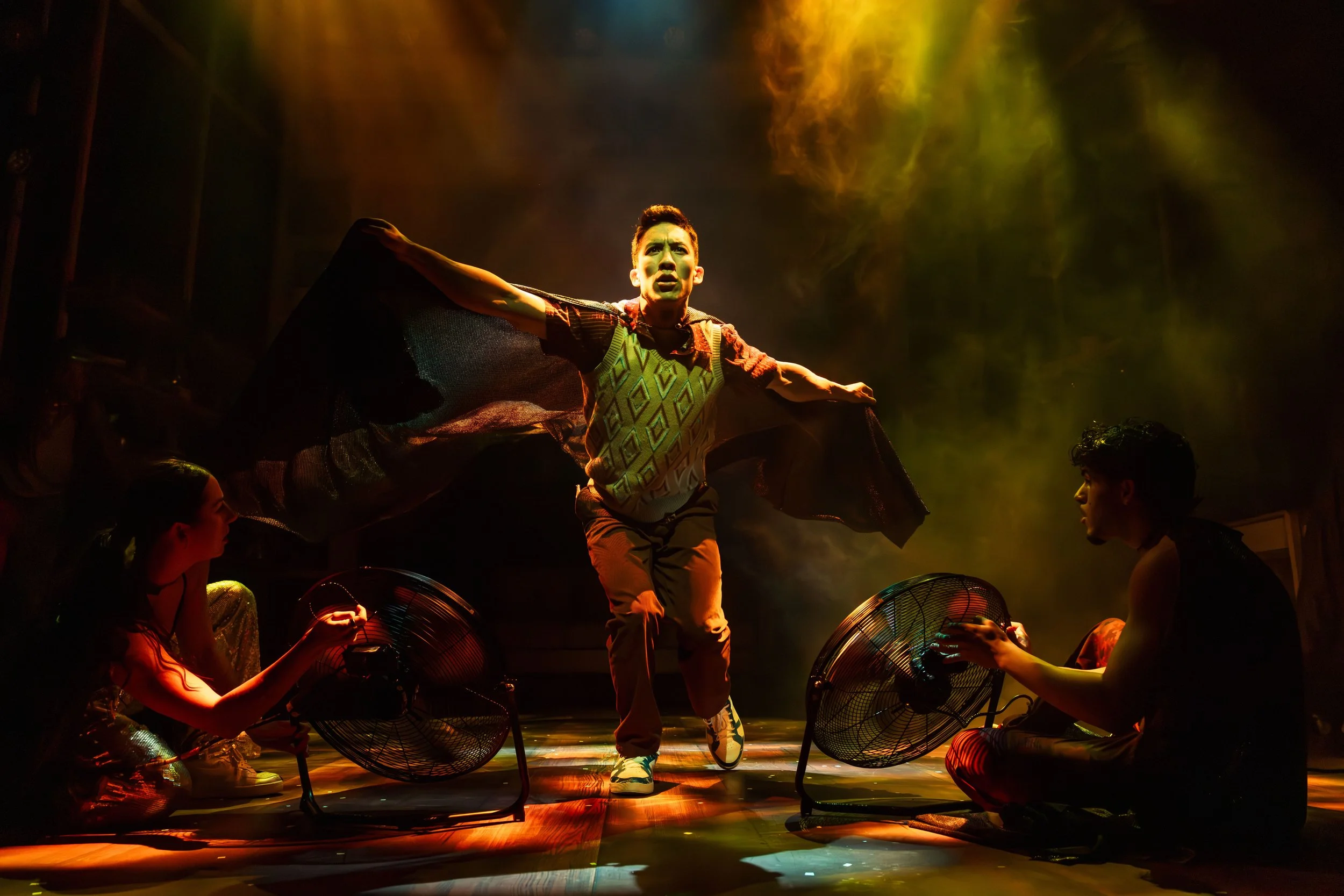 Barbara Erin Delo’s costumes are an eye-popping cornucopia of colors, textures, and patterns. Aché (“Our Famous Friend”) wears an outfit that blends past and present (think Jimi Hendrix circa 1960s blended with 1980s à la voguing club dancers). Tall and sinewy, Aché—the character we know the least about—has an expressive face that mixes playfulness with a “Back off!” vibe, fitting for a celebrity persona. Jacob Aviner’s music mix offers a fun soundtrack that highlights old and new, re-imagining the beats and vibe of each. There are some especially fun mixes, such as a blend of TV ads that cuts and splices the Friends theme song “Sometimes you wanna go where everybody knows your name” to the Meow Mix jingle: “Meow, meow, meow, meow… Meow mix, tastes so good cats ask for it by name.”