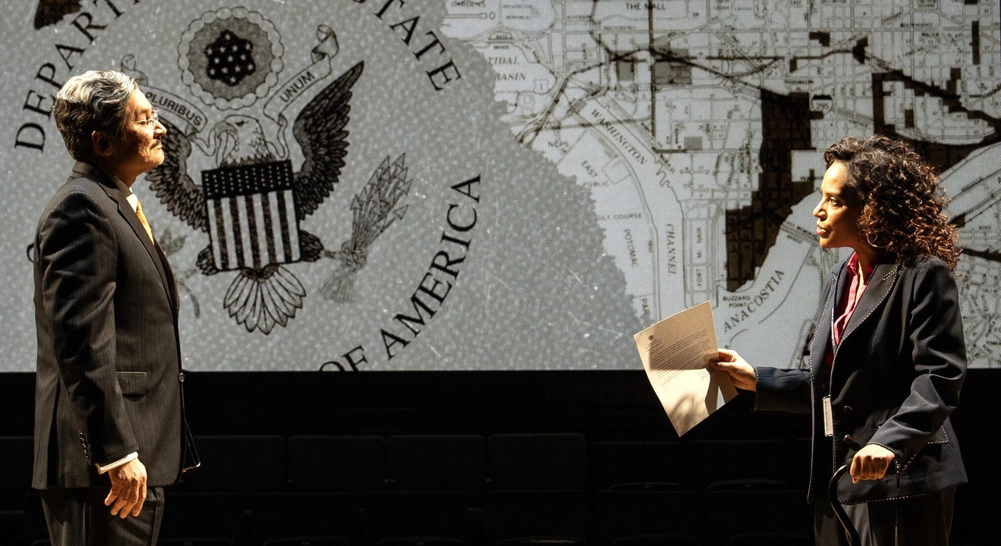 Al Rodrigo, as Cuban diplomat Jorge Bolaños, and Zabryna Guevara, as American diplomat Julissa Reynoso, tread warily with each other in Reynoso’s autobiographical drama Public Charge, co-written by Michael J. Chepiga.