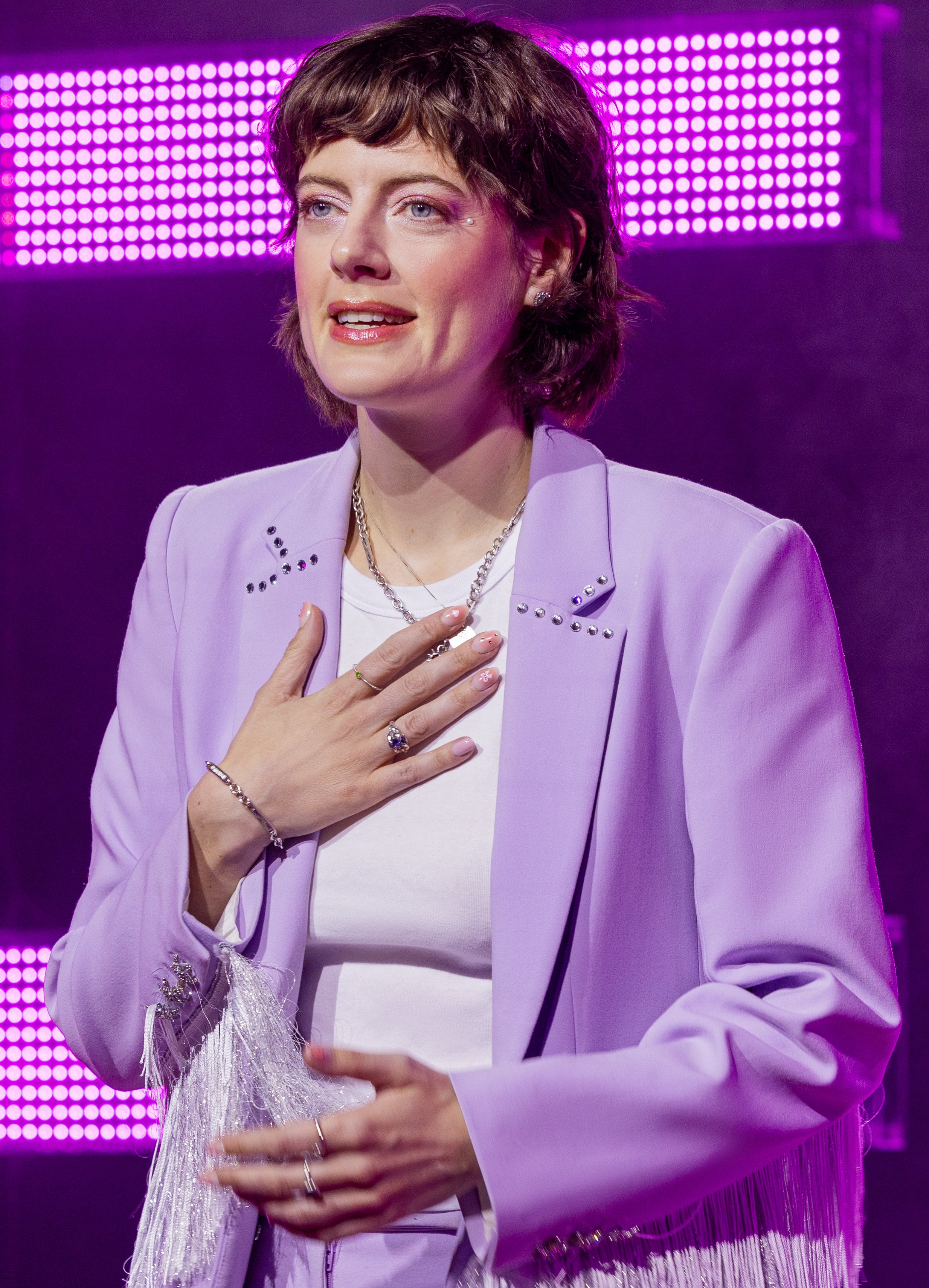 Entering in a white suit with bell-bottoms and long fringes on her suit jacket, and with the aplomb of a stand-up comic, McCracken speaks to the audience: “Is anyone here heartbroken, or grieving, or otherwise bereft? Doesn’t take much—just a little energy towards the thought: ‘Yes, I’m heartbroken, or grieving, or otherwise bereft.’” About her singing, she explains, “I read that it’s good for you. It suppresses cortisol in the body, which relieves stress.” It’s a foreshadowing of the blend of personal emotions and science that undergirds her show. Then she segues into her own story. Advice from her mother sets the tone: