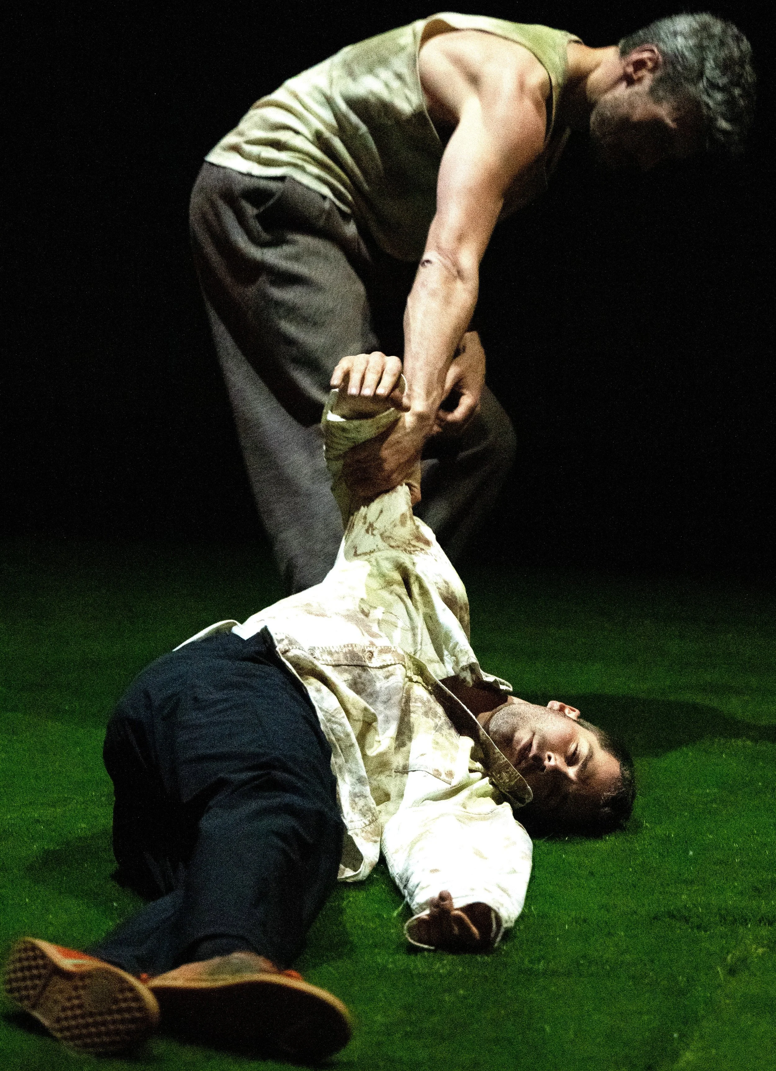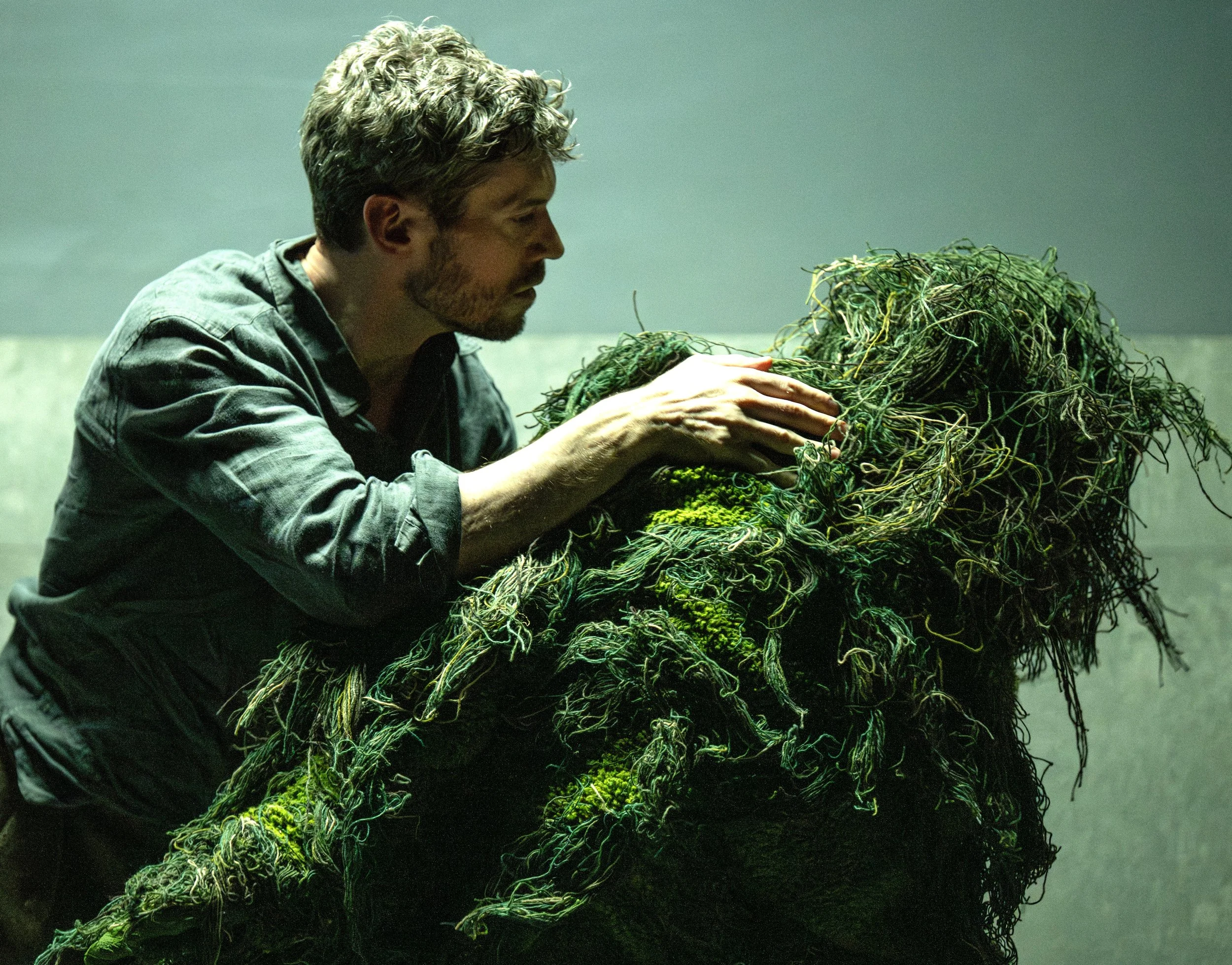 To convey the intimacy McKay has with the land, the interrogation morphs into a duet with a grassy, Sasquatch-type creature (Carney-Faleatua). As McKay explains how he refurbished the soil by cutting away at it and scorching it so it could be revived, he dances with the creature who twirls him and swallows him up in its grassy arms, only for him to emerge and lie on top of it.