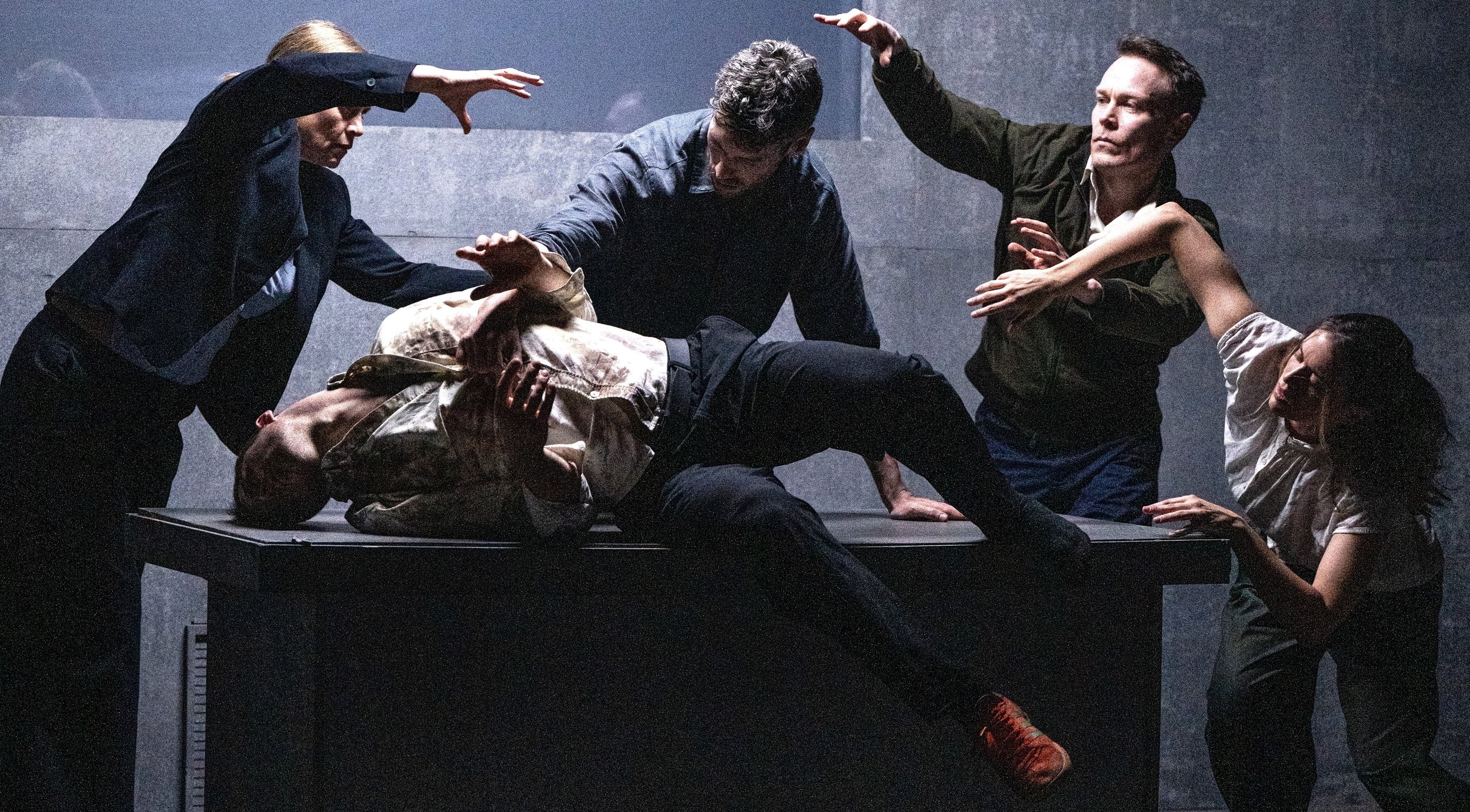 William Dean (Will Thompson, lying on table) appears throughout the play as both living and dead, while the cast of Scorched Earth (from left: Sarah Dowling, Luke Murphy, Ryan O’Neil and Tyler Carney-Faleatua) reveals the circumstances of his death through dance and narration.