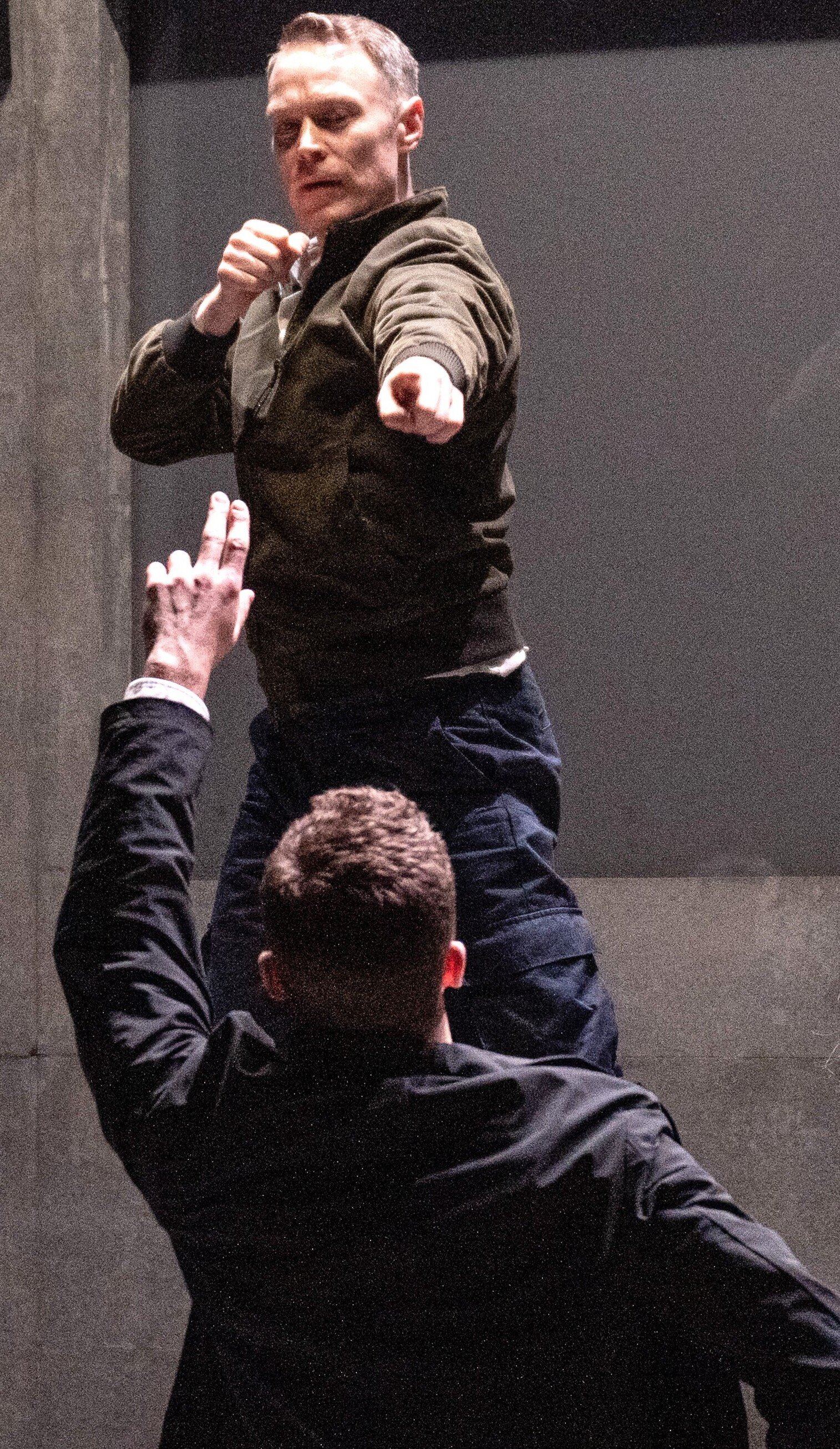 The rural Irish landscape laid out is brooding and dark. Throughout, a dancer in a donkey mask appears on the periphery, like a creature conjured by a shaman. Moody lighting (Stephen Dodd) and a stage painted in shades of gray emphasize a sense of desolation. Alyson Cummins’s simple set has many surprises: performers turn a door into a telephone booth, a bar into an interrogation room and, at one point, the set is dismantled by the dancers to reveal an emerald-green hill peppered with rocks which dancers climb up on and roll down. A soundtrack (Rob Moloney) filtering songs such as The Chain by Fleetwood Mac and Wayfaring Stranger, a traditional American folk song, through an ethereal lens extends the ominous feeling.